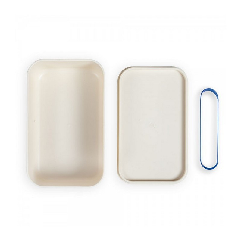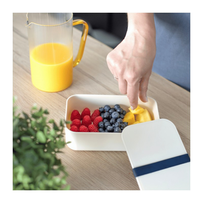 A krémszínű test és a kék pánt kombinációja visszafogott, mégis karakteres összhatást kelt. Ez a színpárosítás nőknek és férfiaknak egyaránt jól használható, így az ételhordó doboz sokféle életstílushoz illeszkedik – legyen szó irodai környezetről, iskoláról vagy szabadidős programokról.