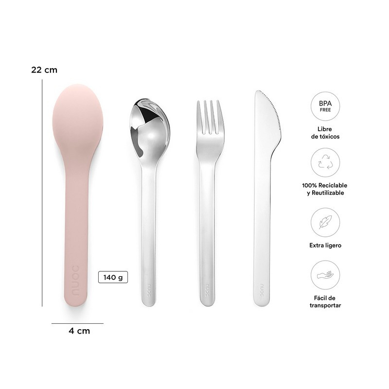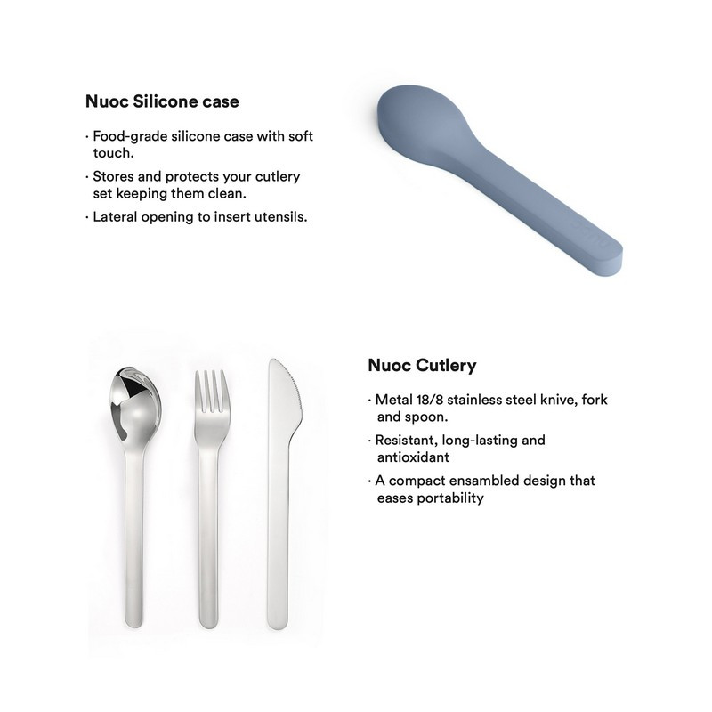 - Tartalom: Egy rozsdamentes acélból készült kanál, villa és kés, amely egy kompakt, környezetbarát szilikon tokban tárolható.