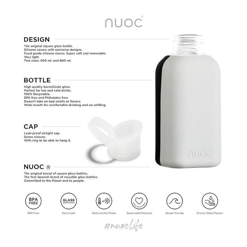 A Nuoc üvegpalack többször használható alternatívát kínál az egyszer használatos műanyag palackokkal szemben. Rendszeres használata segíthet csökkenteni a műanyag hulladék mennyiségét, miközben praktikus és esztétikus kiegészítője a mindennapoknak.